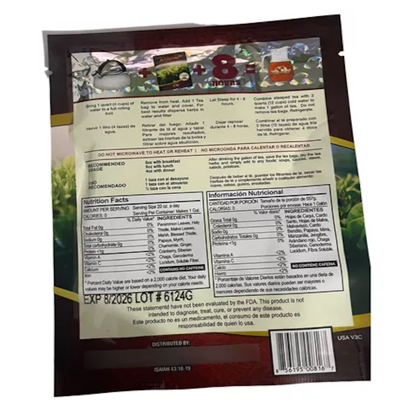 Hojas de caqui, cardo santo, hojas de malva, hojas de malvavisco, cardo bendito, papaya, mirra, manzanilla, jengibre, arándano, chaga siberiano, reishi y fibra soluble.